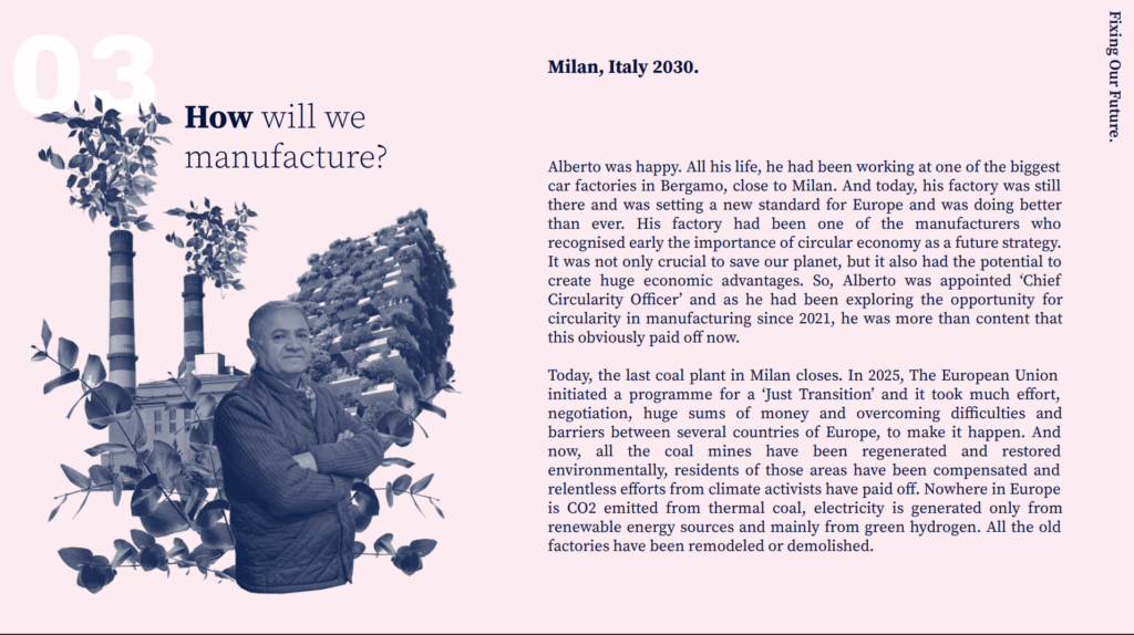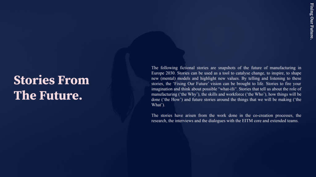 ‘Fixing Our Future’ explores the future of manufacturing in Europe and collaboratively creates a hopeful vision, outlining where we imagine manufacturing will be as we move towards 2030 for EIT Manufacturing (EITM).
