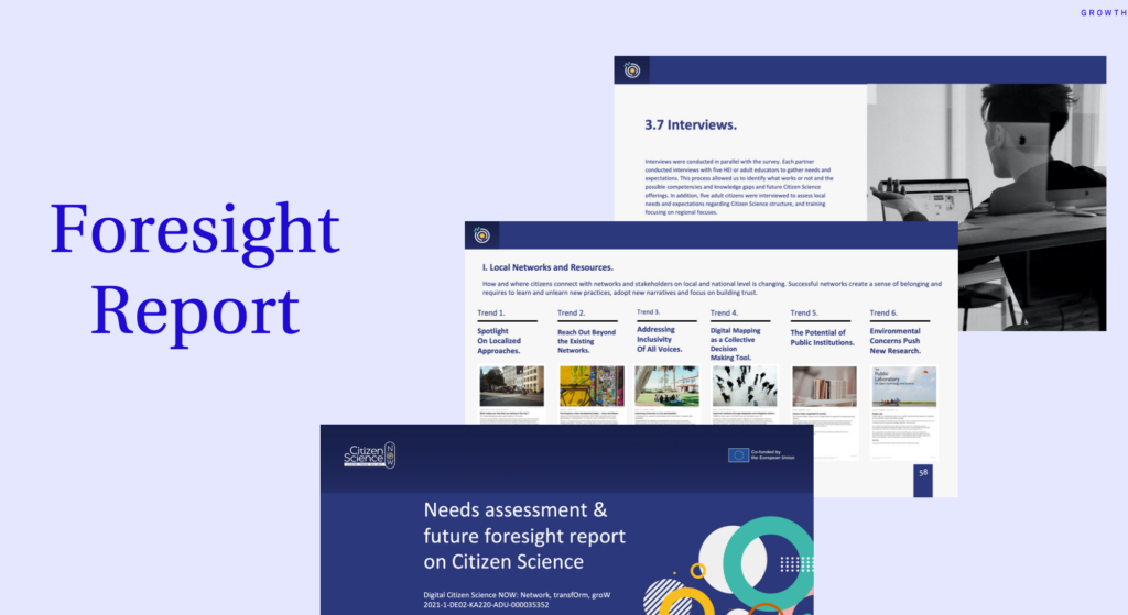 While resources are provided to researchers and practitioners on how to tap into the potential of Citizen Science, the knowledge and skills needed by citizens, citizen science practitioners, and many other social actors to achieve such participation are frequently overlooked. As part of an EU-funded project ‘Citizen Science Now’, the Needs assessment & future foresight report of the Erasmus+ project “Digital Citizen Science: Network, transfOrm, groW” aims to address this gap by providing insights concerning citizens’ behaviours, motivations, and change signals on Citizen Science at the European level. The report captures and delivers on the needs-assessment research and findings generated via futures design principles.