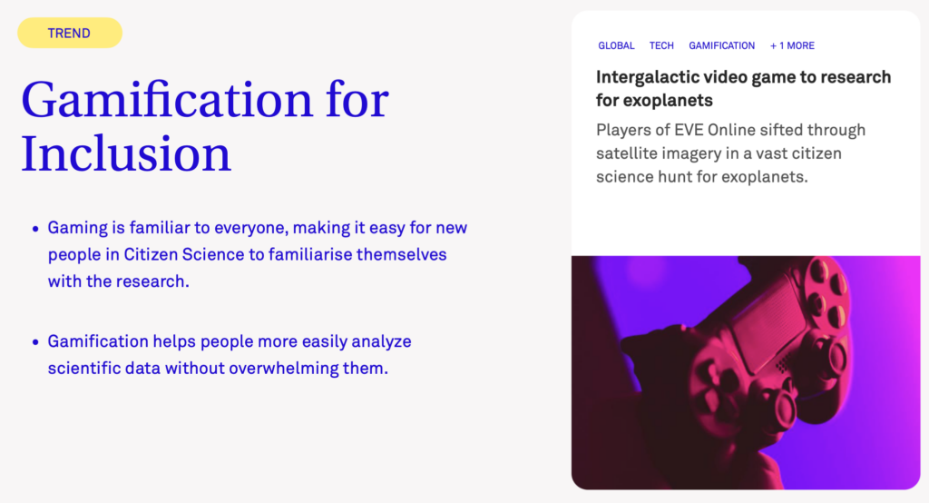 The insights that we have extracted from the signals demonstrate the status quo of the Citizen Science sector as well as examples that lead the way of the industry. The findings would help the university partners to take these findings into the development of a digital training program that equips citizens with the capacity for Citizen Science projects.