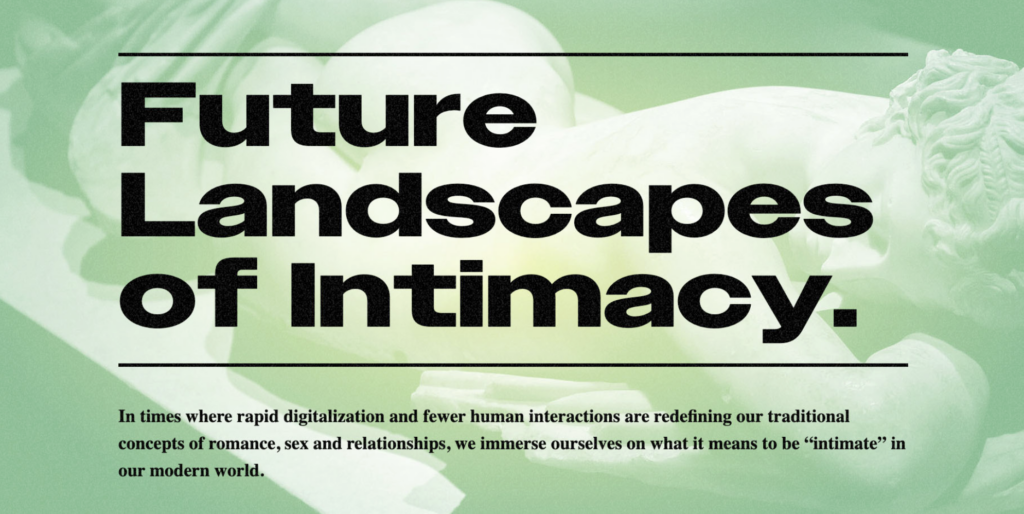 As designers and futurists, we are intrigued by the role of intimacy in our modern world and in our future. Questions such as What is intimacy (and what is it not)? How are traditional conceptions of romance, sex, and relationships changing and evolving? How do we experience the role of technology in reshaping what it means to be intimate? are not only fascinating but also matter. Quite frankly, we believe human connection and intimacy are major forces shaping the future of love, work, learning, society, and humanity.