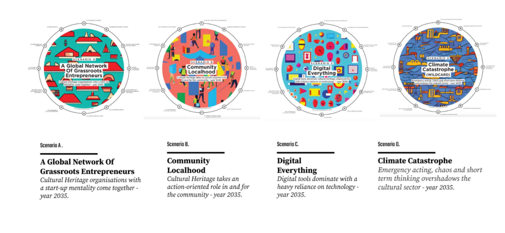 In the end, reflections and impacts were mapped in the responses, their relationships and outcomes, and four final scenarios were developed from these inputs. The scenario narratives reflect the group’s collective opinion and dominant views. These scenarios aim to inspire, rehearse, and reimagine what might lie ahead for the European Cultural Heritage Sector.